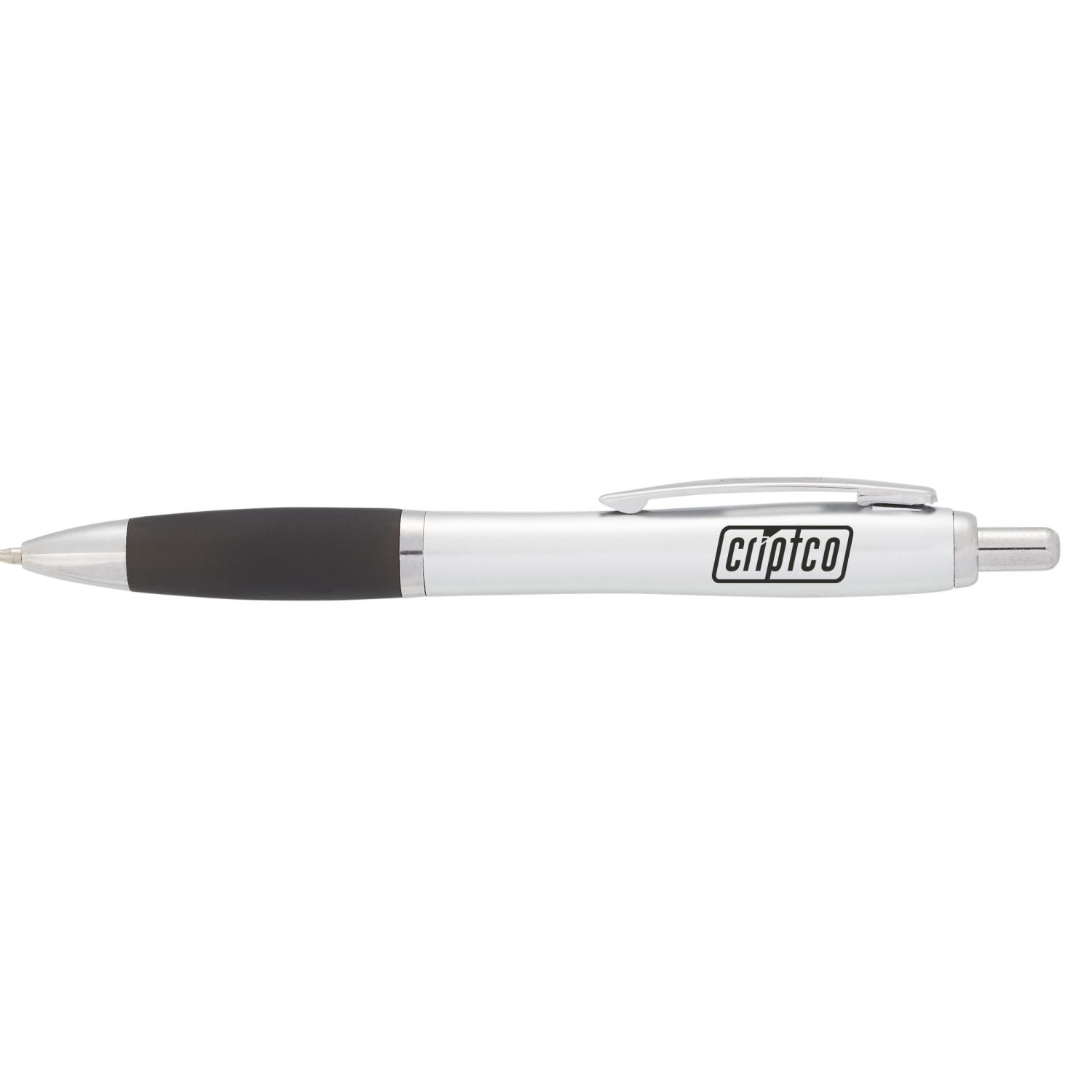 The Nash Ballpoint Pen features a click-action retractable ballpoint with a black ink cartridge. The barrel features a comfortable soft grip, available in multiple colors. Soft grip not compatible with solid silver. 0.00″ D x 0.39″ W x 5.50″ H